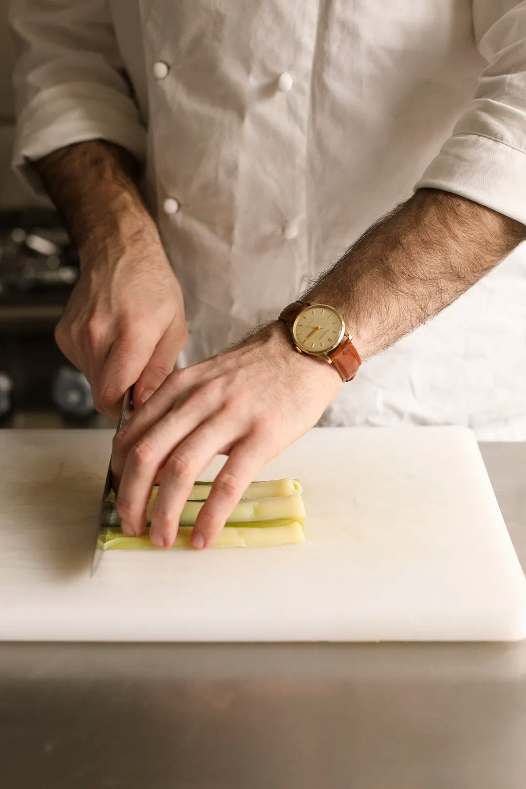 Spring means asparagus! The first ones have just arrived, so I'll cook you some green asparagus with wild garlic... and an egg cooked in rice vinegar! The asparagus will be sautéed in olive oil, deglazed with sake, with an egg yolk, a little Parmesan, and a little wild garlic condiment.
