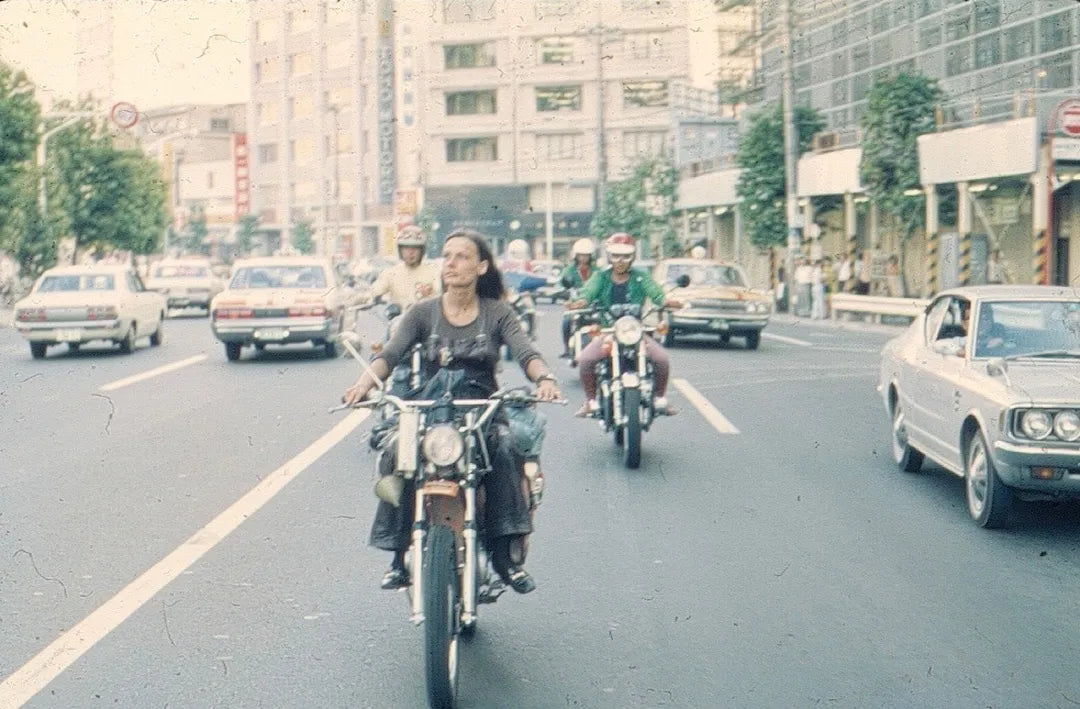 So in the 70s, the image of the biker was a wildly erotic object, if we believe Brigitte Bardot and the Harley Davidson that did things to her kidneys. It didn't work for me, so I think I had a form of frigidity! For Édith Piaf, it was "wearing motorcycle pants and boots, and on the pale skin you could read "Maman je t'aime"... It was the image of the thug who terrorized everyone. As for me, I got hit on quite a bit, but it must be said that in '68 we were discovering shorts. So I went to Carnaby Street in London to buy little shorts. I don't remember the name of this little fashion house that was great... I rode my motorcycle in Paris with my little shorts, Rosy lace tights, and one day an old lady attacked me with an umbrella, telling me it was a scandal and a shame.